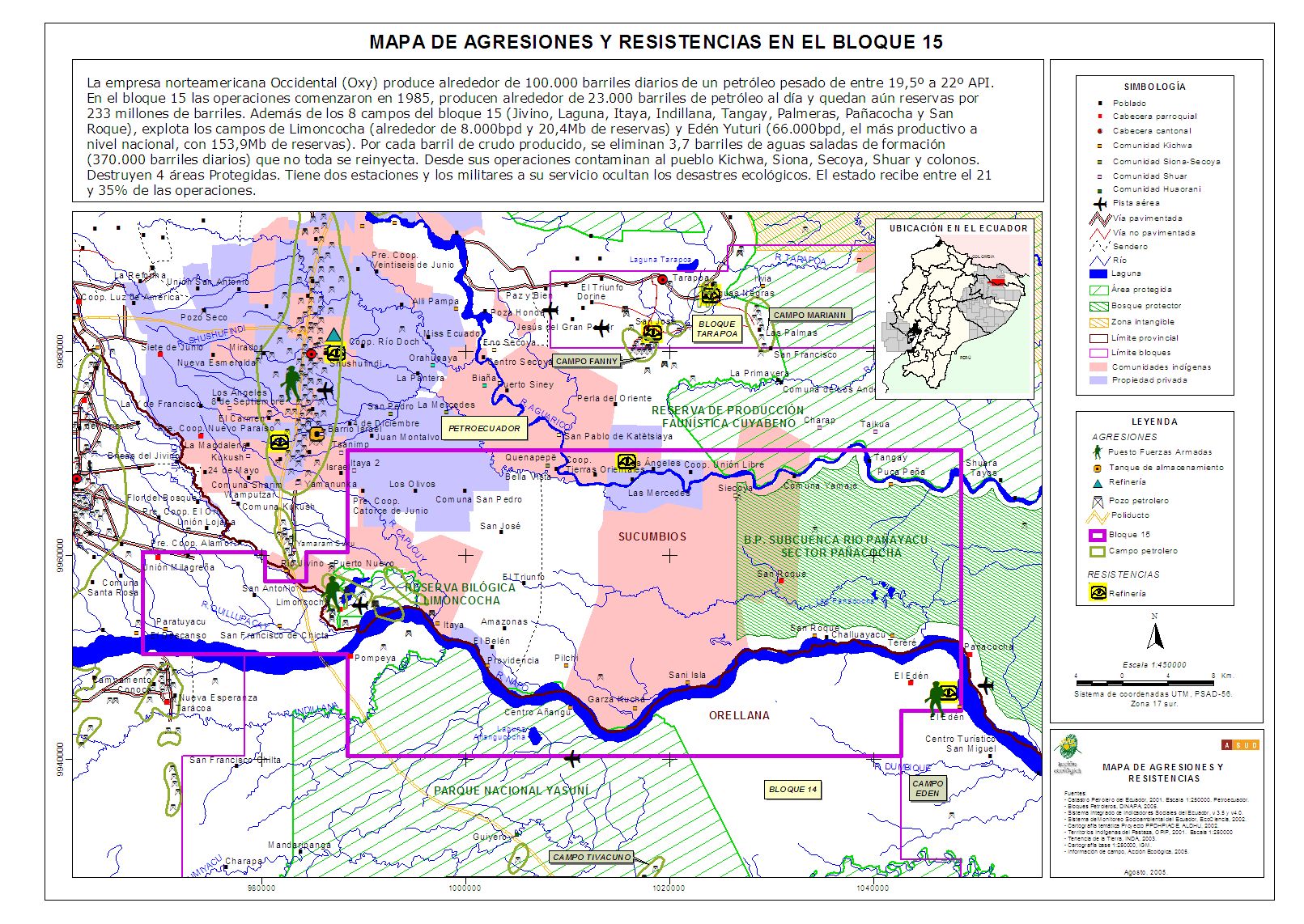 El paro de Orellana y Sucumbíos, que durante el mes de agosto del 2005 lanzó a la calle a millares de personas, es una clara demostración de que la población está cansada de la humillación transnacional, pero también de que la dignidad no está perdida. Para el pueblo que lucha, este “Atlas Amazónico del Ecuador: Agresiones y Resistencias”.