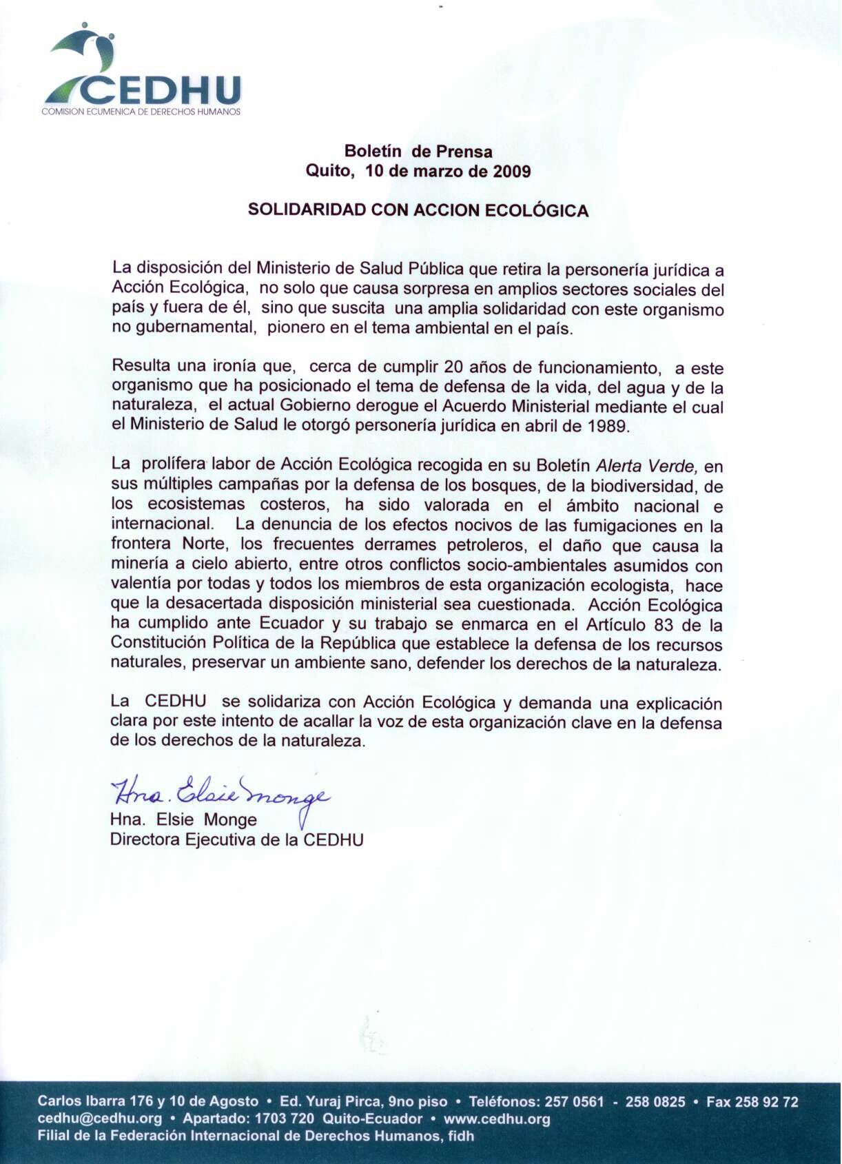 La CEDHU se solidariza con Acción Ecológica y demanda una explicación clara por este intento de acallar la voz de esta organización clave en la defensa de los derechos de la naturaleza. “Esta defensa de las comunidades y del medioambiente está en concordancia con la Constitución que se acaba de aprobar, donde se resalta inclusive los derechos de la naturaleza como tal”, puntualizó Monje.